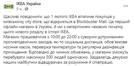 1 февраля IKEA открывает первый офлайн-магазин в Украине. Он будет располагаться в Киеве, в Blockbuster Mall. Магазин будет работать с 10:00 до 22:00. Согласно карантинных ограничений, в магазине смогут находиться максимум 500 человек одновременно.