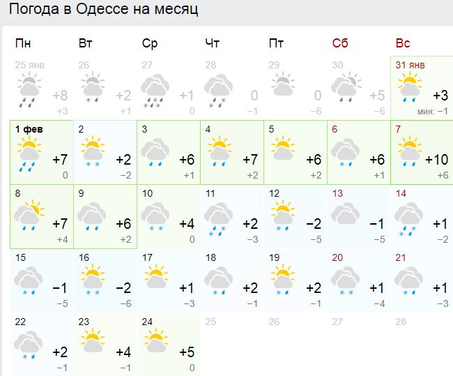 В Одессе в феврале обещают в основном плюсовую температуру и дожди. Самой теплой будет первая половина месяца, когда термометры покажут от +2 до +10 днем и 0...+6 ночью. В этот период будут идти дожди, иногда с мокрым снегом.
