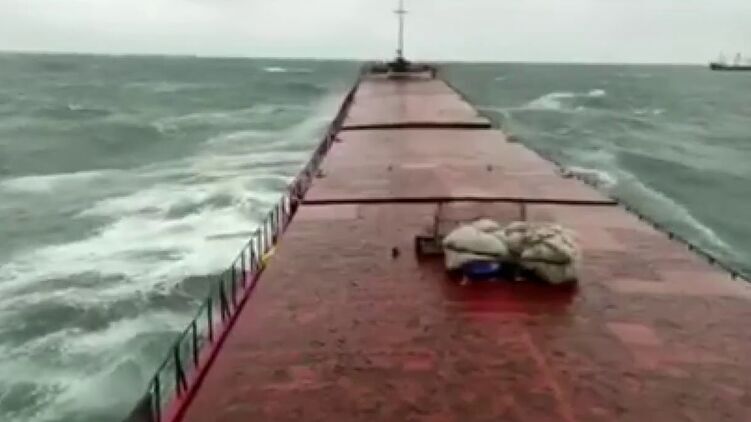 Предположительно, кадры сняты с капитанского мостика. На них видна носовая часть судна, которая буквально на глазах ломается после мощного удара крупной волны.