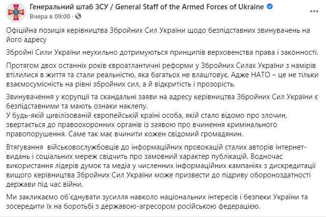 Генштаб же еще раньше выпустил заявление, в котором сообщил, что все обвинения волонтеров безосновательны. Но сам конфликт между генералами при этом ни одна, ни вторая стороны не упоминали.