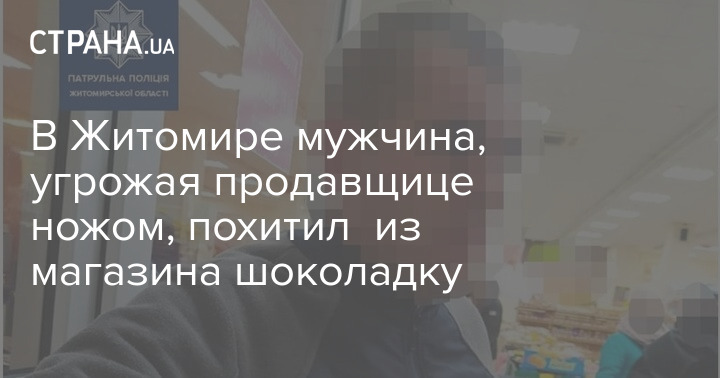 В одном из магазинов Житомира мужчина с ножом, угрожая продавцам расправой, украл шоколадку. Инцидент произошел вечером в понедельник, 1 февраля, сообщает Патрульная полиция Житомирской области.