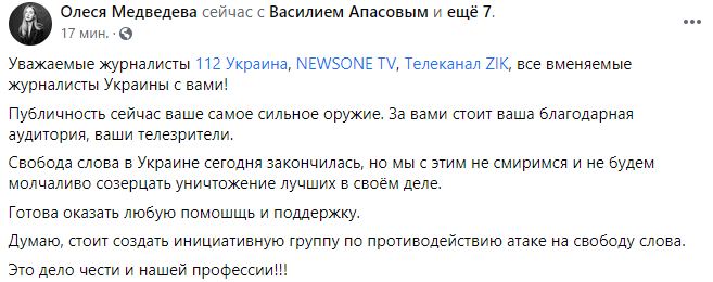 "Уважаемые журналисты 112 Украина, NEWSONE TV, Телеканал ZIK, все вменяемые журналисты Украины с вами!