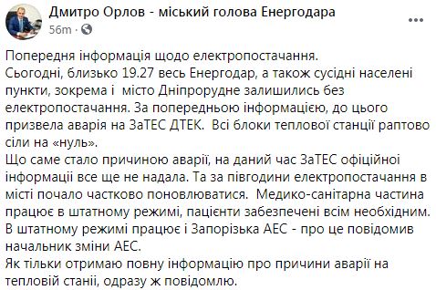 "Предварительная информация о электроснабжения. Сегодня, около 19.27 весь Энергодар, а также соседние населенные пункты, в том числе и город Днепрорудное остались без электроснабжения. По предварительной информации, к этому привела авария на ЗаТЭС ДТЭК. Все блоки тепловой станции внезапно сели на "ноль", - пишет Орлов.