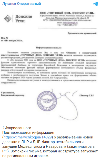 Через несколько дней, 21 января, Telegram-канал "Луганск оперативный", критикующий сепаратистов, также написал о причастности Медведчука к зарегистрированной в Ростове-на-Дону компании "Донские угли".