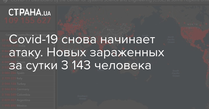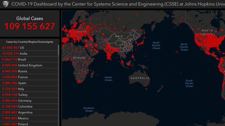 По данным на 16 февраля, число зараженных на Земле перевалило за 109 миллионов, фото: университет Дж. Хопкинса