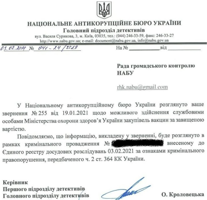 "Обнародованная цена закупки 1 дозы вакцины стала едва ли не самой высокой в ​​мире, а ее "общая эффективность" во время последнего этапа тестирования в Бразилии показала лишь 50,38%. Предварительная правовая квалификация: злоупотребление властью или служебным положением, повлекшее тяжкие последствия (ч. 2 ст. 364 Уголовного кодекса Украины)", - указали в Общественном совете и показали подтверждающий открытие дела документ.