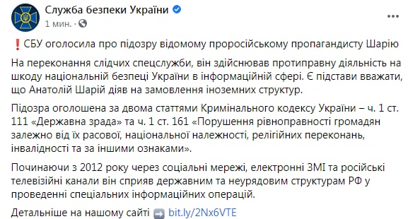 Служба безопасности Украины объявила о подозрении по двум статьям (государственная измена и нарушение равноправия граждан) известному блогеру, лидеру "Партии Шария" Анатолию Шарию.