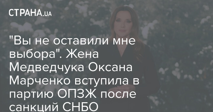 Бывшая телеведущая и жена народного депутата и главы политсовета партии "Оппозиционная платформа - За жизнь" Виктора Медведчука Оксана Марченко, против которых СНБО вчера ввел санкции, заявила, что с сегодняшнего дня вступает в партию ОПЗЖ.