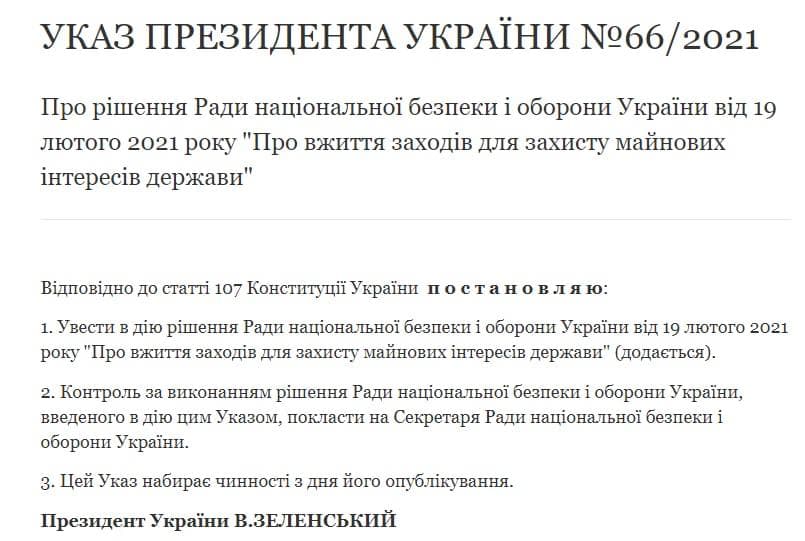 Президент Украины Владимир Зеленский подписал указ о решении Совета национальной безопасности и обороны Украины от 19 февраля 2021 "О принятии мер по защите имущественных интересов государства".