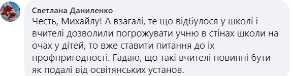 "Честь Михаилу! А вообще, то, что произошло в школе и учителя позволили угрожать ученику в стенах школы на глазах у детей, то уже ставит вопрос о их профпригодности. Думаю, что такие учителя должны быть как можно дальше от образовательных учреждений", – продолжает усугублять конфликт Светлана Даниленко.