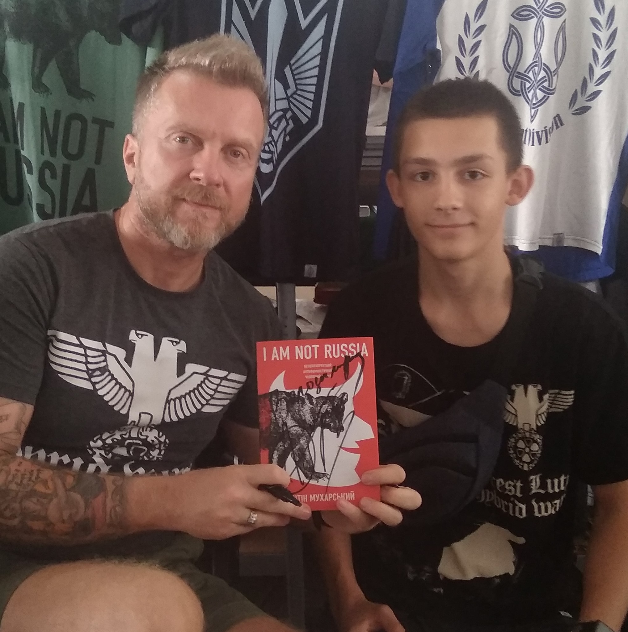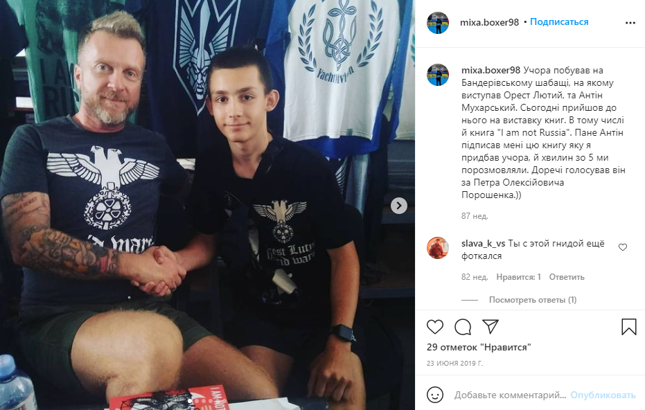 Он также позирует вместе с известным националистом Антином Мухарским, который выступает под сценическим именем Ореста Лютого и борется за утверждение всего украинского в Украине.