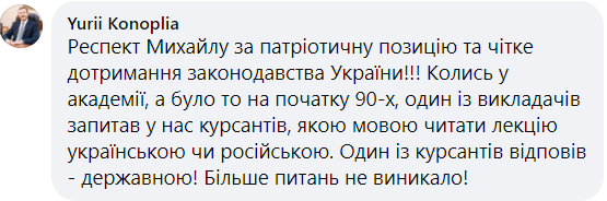 Преподаватели заняли нейтральную сторону и не стали разбираться с учащимся. Мало того, вся школа якобы слышала, как "Михасик объяснял: "Вы пришли в украинскую школу, вы представители украинских вузов, вы представляете Вооруженные силы Украины. Не России. Вы не имеете уважения ни к языку, ни к Украине. Поэтому или вы общаетесь на украинском, или кина не будет", – патетическим стилем описывает кульминацию скандала Пономаренко-старший.