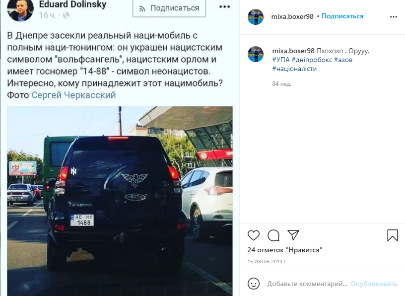 Школьник также позволяет себе иронизировать над постом главы Украинского еврейского комитета Эдуарда Долинского о том, как в Днепре "засекли реальный наци-мобиль с полным наци-тюнингом".