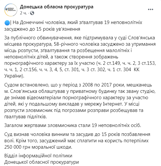 В Донецкой области суд при поддержке Славянской местной прокуратуры вынес приговор 58-летнему мужчине. Ему дали 15 лет тюрьмы за содержание притонов, изнасилование и растление малолетних и несовершеннолетних детей, а также создание порнографии с их участием.