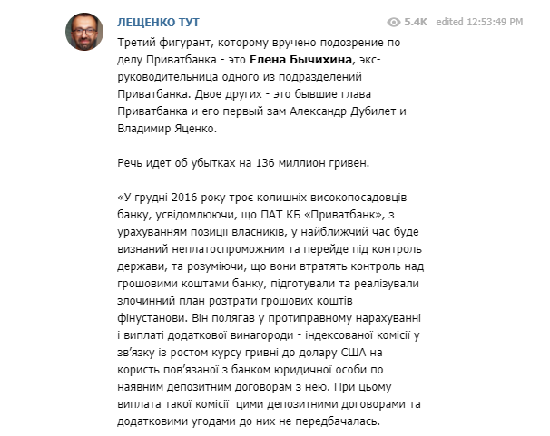"Третий фигурант, которому вручено подозрение по делу Приватбанка - это Елена Бычихина, экс-руководительница одного из подразделений Приватбанка. Двое других - это бывшие глава Приватбанка и его первый зам Александр Дубилет и Владимир Яценко. Речь идет об убытках на 136 миллион гривен", - написал бывший народный депутат.