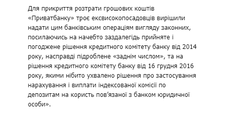 Еще одно подозрение, по данным Офиса генпроуроа объявили бывшей начальнице департамента финансового менеджмента, которая одновременно занимала должность первого заместителя председателя правления связанного с банком юридического лица (вероятно, речь идет о Елене Бычихиной).
