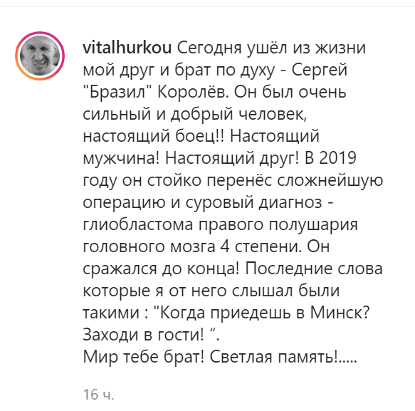 "Сегодня ушел из жизни мой друг и брат по духу — Сергей "Бразил" Королев. Он был очень сильный и добрый человек, настоящий боец! Настоящий мужчина! Настоящий друг! В 2019 году он стойко перенес сложнейшую операцию и суровый диагноз — глиобластома правого полушария головного мозга 4 степени. Он сражался до конца! Последние слова которые я от него слышал, были такими: "Когда приедешь в Минск? Заходи в гости!". Мир тебе брат! Светлая память!..", — написал Гурков в Instagram.