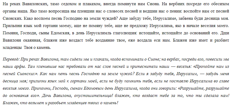 В последний раз поется 136-й псалом "На реках Вавилонских", а в церковных текстах звучит яркое напоминание о цели предстоящего поста - Светлом Христовом Воскресении.