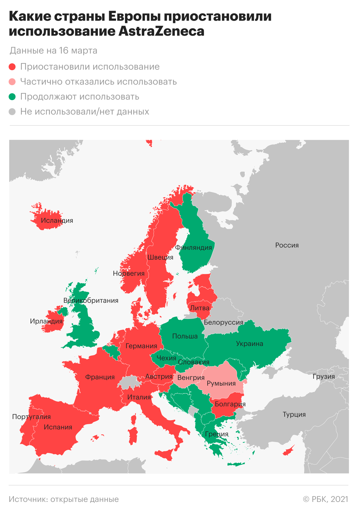 Полностью приостановили вакцинацию препаратом AstraZeneca на одну-две недели в Германии, Франции, Испании, Италии, Нидерландах, Исландии, Дании, Норвегии, Литве, Латвии, Эстонии, Швеции, Ирландии, Португалии, Болгарии, Люксембурге, Словении, на Кипре, в Индонезии, Конго и Таиланде.