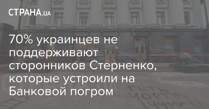Большинство украинцев (70%) не поддерживают действия участников акции сторонников радикала Сергея Стерненко, которые 20 марта устроили на Банковой погром. 20% жителей страны считают, что на тех, кто повредил фасад здания Офиса президента, должны быть заведены уголовные дела, которые, возможно, приведут к тюремным срокам.
