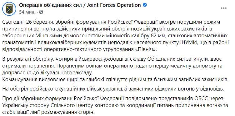 Напомним, вечером 26 марта появилось сообщение о том, что четверо украинских военных погибли в районе поселка Шумы на Донбассе под минометным обстрелом противника.