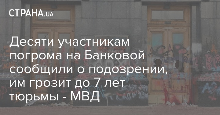 Правоохранители сообщили о подозрении в хулиганстве десяти участникам погрома на Банковой, который произошел в ходе акции сторонников приговоренного к сроку радикала Сергея Стерненко. Подозреваемым грозит до 7 лет тюрьмы.