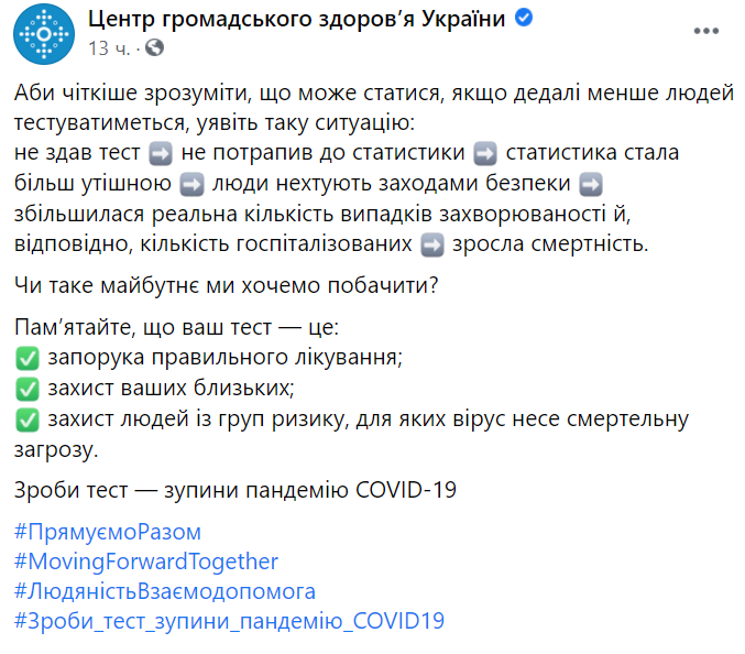 Сделайте тест - остановите пандемию COVID-19", - призвали в Центре общественного здоровья Украины.