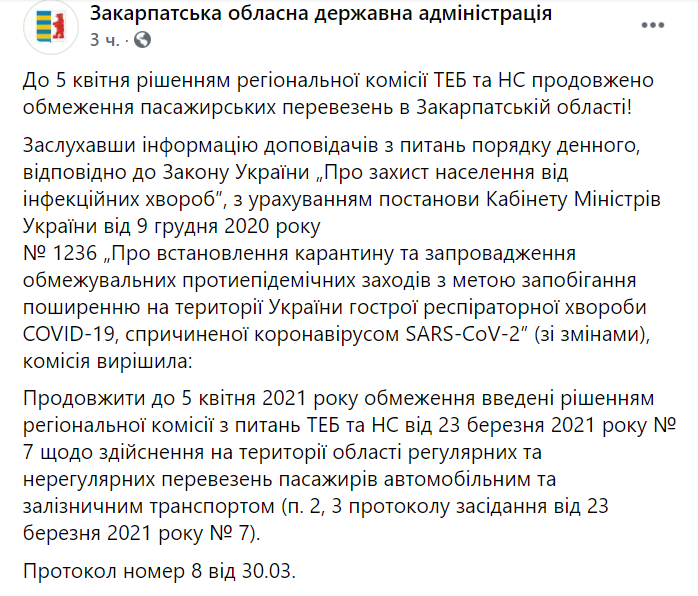 "Заслушав информацию докладчиков по вопросам повестки дня, в соответствии с Законом Украины "О защите населения от инфекционных болезней", с учетом постановления Кабинета Министров Украины от 9 декабря 2020 № 1236 "Об установлении карантина и введения ограничительных противоэпидемических мероприятий с целью предотвращения распространения на территории Украины острой респираторной болезни COVID-19, вызванной коронавируса SARS-CoV-2" (с изменениями), комиссия решила: продлить до 5 апреля 2021 ограничения введеные решением региональной комиссии по вопросам ТЭБ и ЧС от 23 марта 2021 № 7 по осуществлению на территории области регулярных и нерегулярных перевозок пассажиров автомобильным и железнодорожным транспортом (п. 2, 3 протокола заседания от 23 марта 2021 № 7)", - говорится в сообщении, на официальной странице Закарпатской ОГА в соцсети фейсбук во вторник вечером.