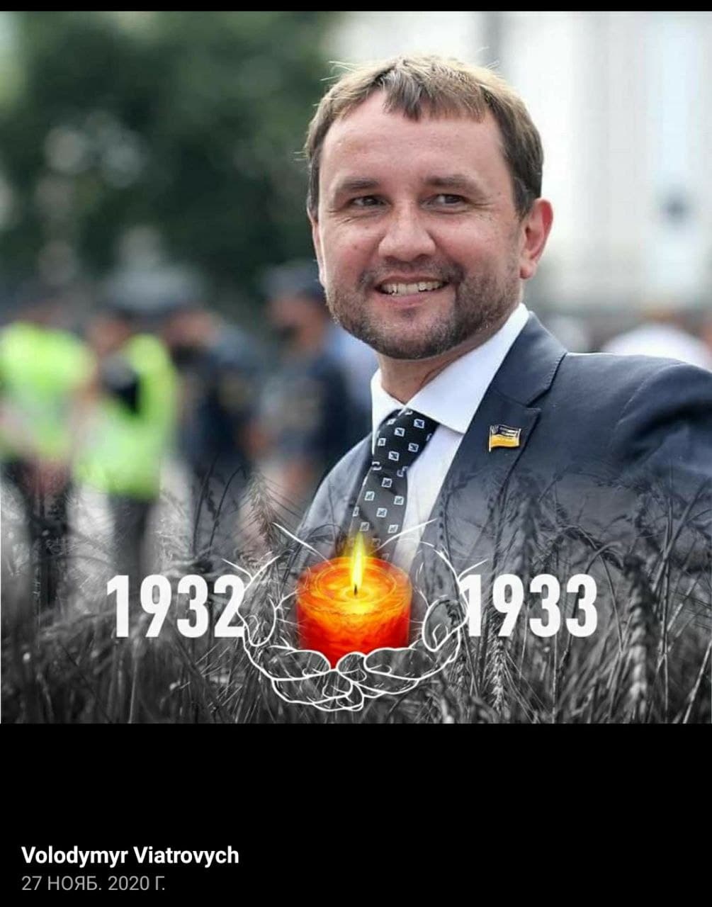 В фейсбук народного депутата Владимира Вятровича есть фото, где он широко улыбается на фоне символики Голодомора 1932-1933 годов.