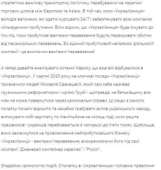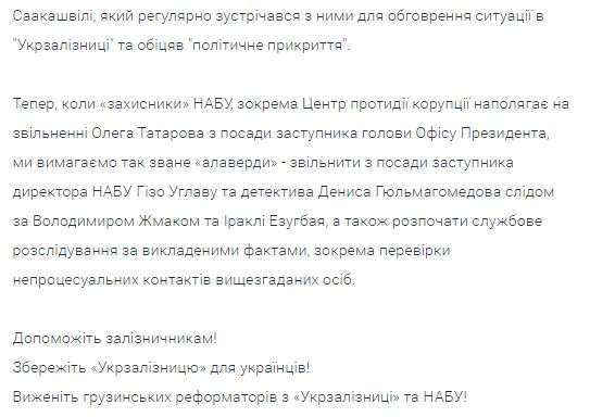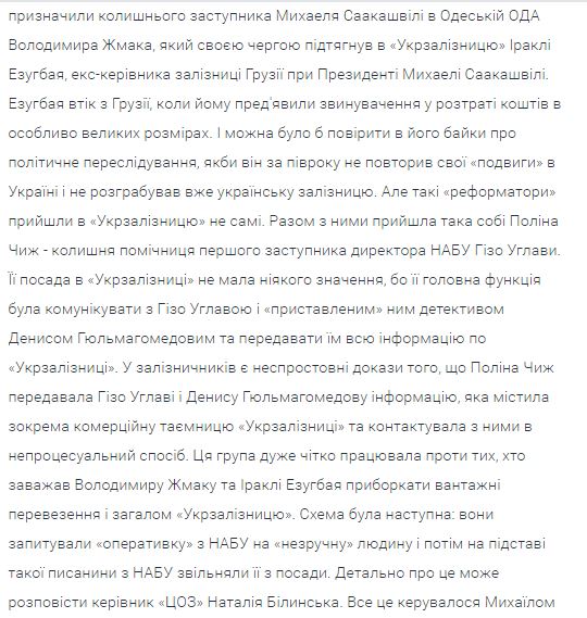 Якобы с помощью этих сливов проникшие в "Укрзализницю" реформаторы Владимир Жмак (экс-зам Саакашвили) и Иракли Эзугбай (экс-руководитель железной дороги Грузии) собирались взять под контроль грузовые перевозки и "Укрзализныцю". В петиции описывается схема: на "неудобного" человека запрашивали "оперативку" в НАБУ и на основе этого его увольняли с должности.