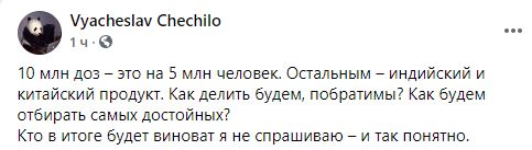 "10 млн доз – это на 5 млн человек. Остальным – индийский и китайский продукт. Как делить будем, побратимы? Как будем отбирать самых достойных?