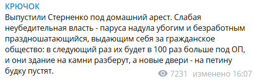 "Выпустили Стерненко под домашний арест. Слабая неубедительная власть – паруса надула убогим и безработным праздношатающимся, выдающим себя за гражданское общество: в следующий раз их будет в 100 раз больше под ОП, и они здание на камни разберут, а новые двери – на петину будку пустят".
