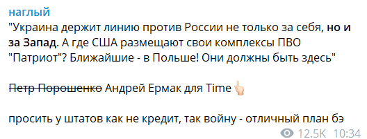 "Украина держит линию против России не только за себя, но и за Запад. А где США размещают свои ракеты Patriot? Ближайшие - в Польше. Они должны быть здесь (в Украине - Ред.)", - сказал Андрей Ермак в интервью журналу Time.