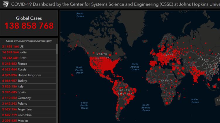 По данным на утро 16 апреля, число зараженных на Земле приближается к 139 миллионам, фото: arcgis.com