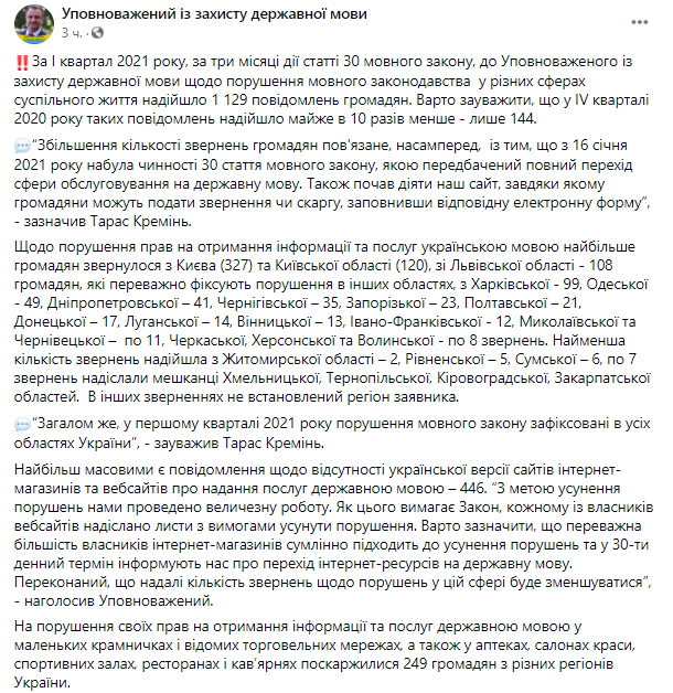 1 129 сообщений о нарушении языкового законодательства в различных сферах общественной жизни получил мовный омбудсмен Тарас Креминь за три месяца действия ст. 30 закона "Об обеспечении функционирования украинского языка как государственного". Об этом сообщается на странице уполномоченного по защите государственного языка в соцсети.