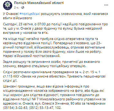 В пятницу, 23 апреля, в городе Очаков Николаевской области неизвестный выстрелил в мужчину и убежал. Пострадавшим оказался военнослужащий, который шел на работу, сейчас он находится в больнице с огнестрельным ранением головы.