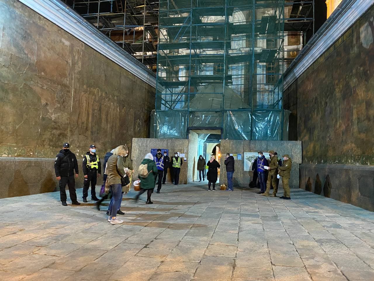 23:22  Полиция и муниципальная стража у входа в Лавру раздают маски.