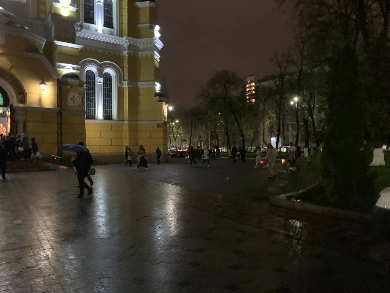 23:14  К Киево-Печерской Лавре съезжаются машины с желающими присутствовать на пасхальной службе.