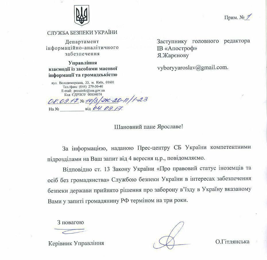 Вот что говорилось в документе: "Согласно ст.13 Закона Украины "О правовом статусе иностранцев и лиц без гражданства", Службой безопасности Украины в интересах обеспечения безопасности государства принято решение о запрете въезда в Украину указанном Вами в запросе гражданину РФ сроком на три года".