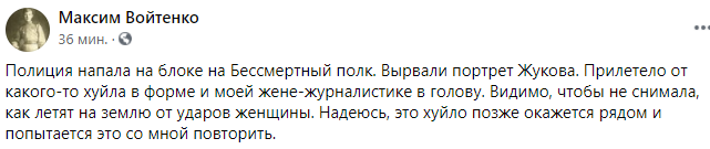 "Полиция напала на блоке на Бессмертный полк. Вырвали портрет Жукова. Прилетело от какого-то х@йла в форме и моей жене-журналистике в голову. Видимо, чтобы не снимала, как летят на землю от ударов женщины. Надеюсь, это х@йло позже окажется рядом и попытается это со мной повторить".