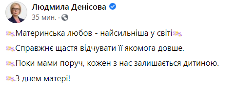 07:40 Сегодня также интересно, кто из представителей власти и политбомонда показательно проигнорирует День Победы. Вот, к примеру, омбудсмен Людмила Денисова поздравила с днем матери, который в Украине отмечают явно меньше, чем 9 мая.