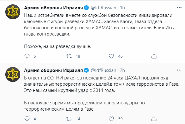 Напомним, что вечером в понедельник, 10 мая, на Ближнем Востоке началась крупнейшая за последние годы эскалация. В ответ на ракетные атаки израильские ВВС поразили 130 палестинских военных целей, ликвидировав 15 членов боевых подразделений контролирующей Газу группировки ХАМАС, а также "Исламского джихада".