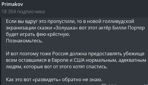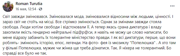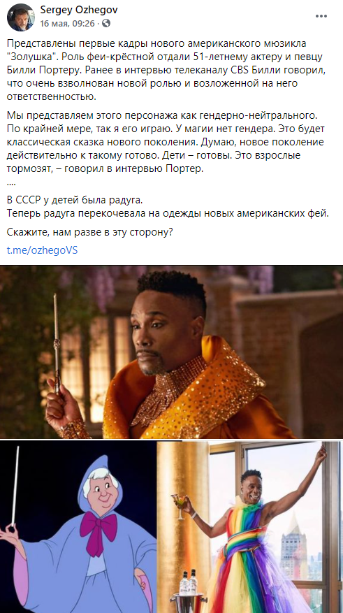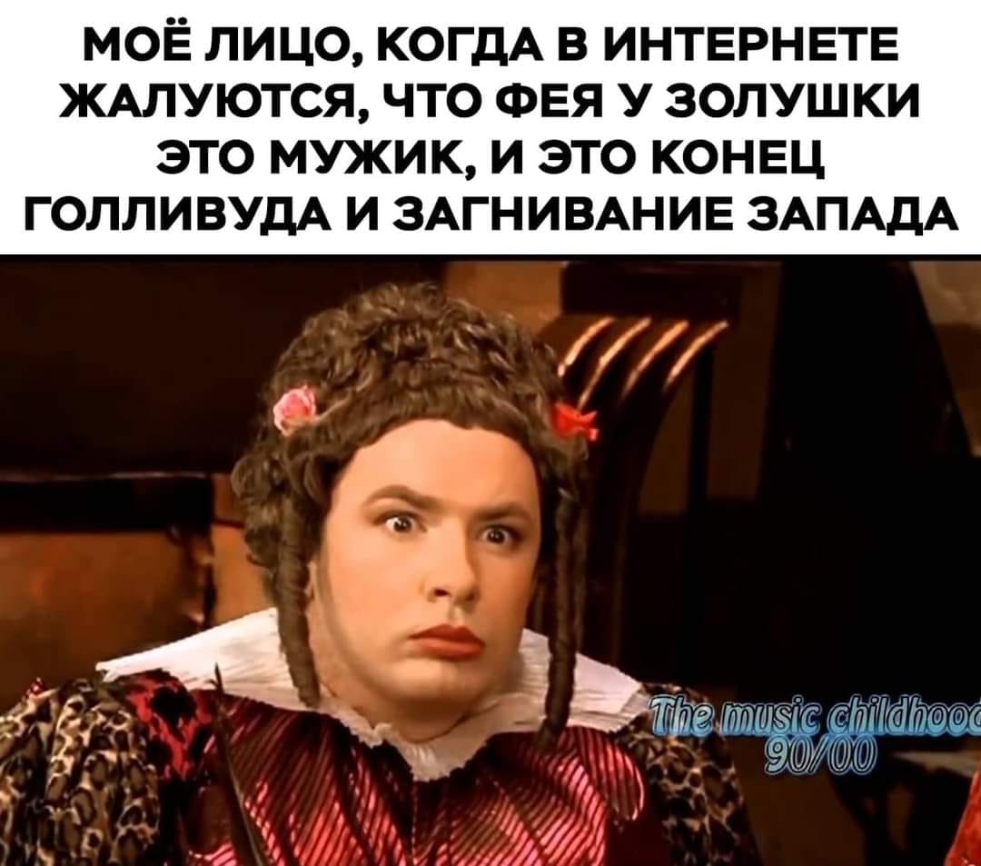 "Мир всегда менялся. Менялась мода, менялись отношения между людьми, ценности. И сейчас мир не стоит на месте. Все стремительно меняется. Однако за изменениями всегда стояла свобода. Люди хотели свободы и отстаивали ее. А теперь какая-то ср@ная диктатура. И как все диктатуры, первое, что они делают, – меняют историю, эпос, легенды. На фото фея из мюзикла "Золушка". А кто там в фильме Золушка – мужик или женщина, еще надо узнать".