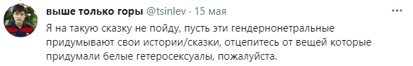"Я на такую сказку не пойду, пусть эти гендерно-нейтральные придумывают свои истории/сказки, отцепитесь от вещей, которые придумали белые гетеросексуалы, пожалуйста", – пишет пользователь с ником tsinlev.