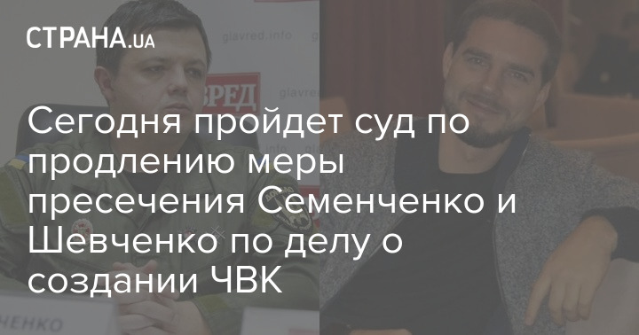 Сегодня в 15:00 в Печерском районном суде Киева начнется судебное заседание по продлению меры пресечения внештатному агенту Национального антикоррупционного бюро Украины Евгению Шевченко и экс-нардепу Семену Семенченко, подозреваемым в причастности к созданию незаконного военизированного вооруженного формирования.