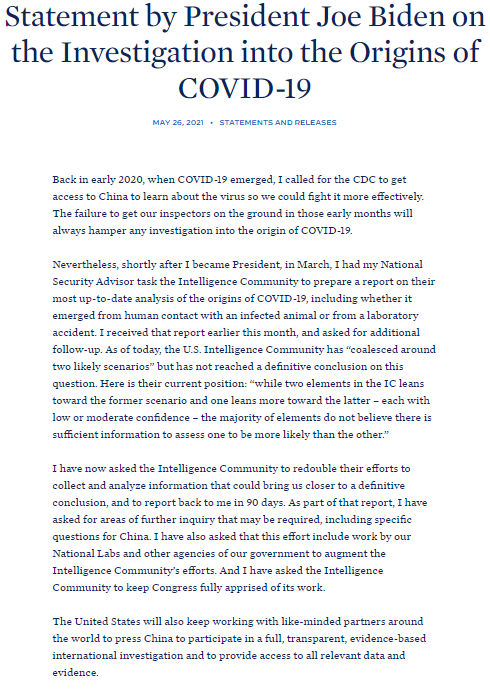 Вчера на сайте Белого дома появилось заявление Байдена о коронавирусе и роли Китая в его распространении.