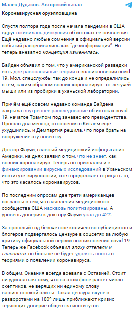 Отметим, что никаких новых данных о том, что вирус вырвался на свободу из китайской лаборатории со времен Трампа не публиковалось.