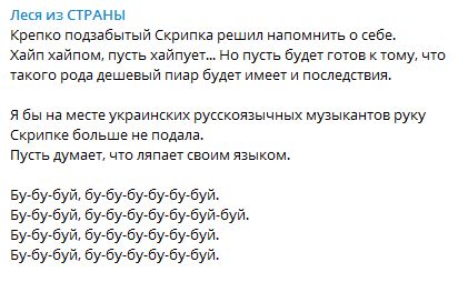 Я бы на месте украинских русскоязычных музыкантов руку Скрипке больше не подала. Пусть думает, что ляпает своим языком.