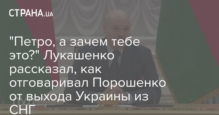 "Петро, а зачем тебе это? Зачем ты выходишь из СНГ? Чем ты перегружен в СНГ?...Ясно, почему он выходил, его просто оттуда вытаскивали...Ну, что тут мы в СНГ такое творим, что может мешать "незалежности" Украины? Да ничего. Вот такой откровенный разговор. (Порошенко - Ред.) Согласился, год терпел, а потом втихую ушел. Ну, и что? Ну, вот результат", - поделился воспоминаниями Лукашенко.