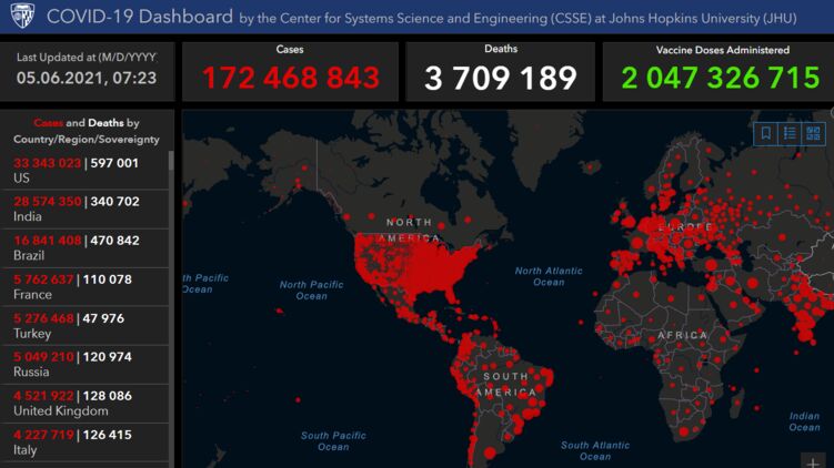 По состоянию на утро 5 июня, число зараженных в мире перевалило за 172 миллиона, фото: arcgis.com